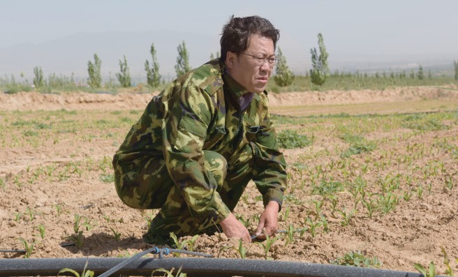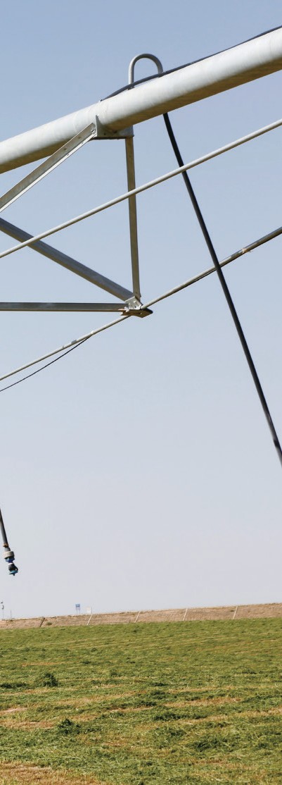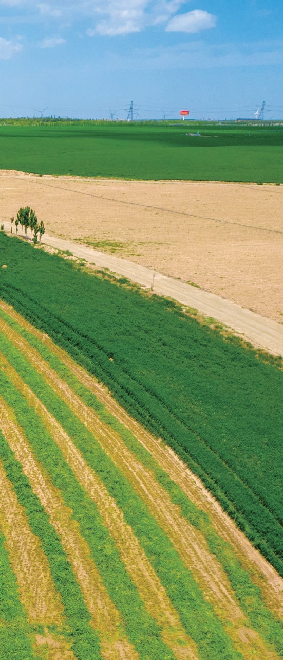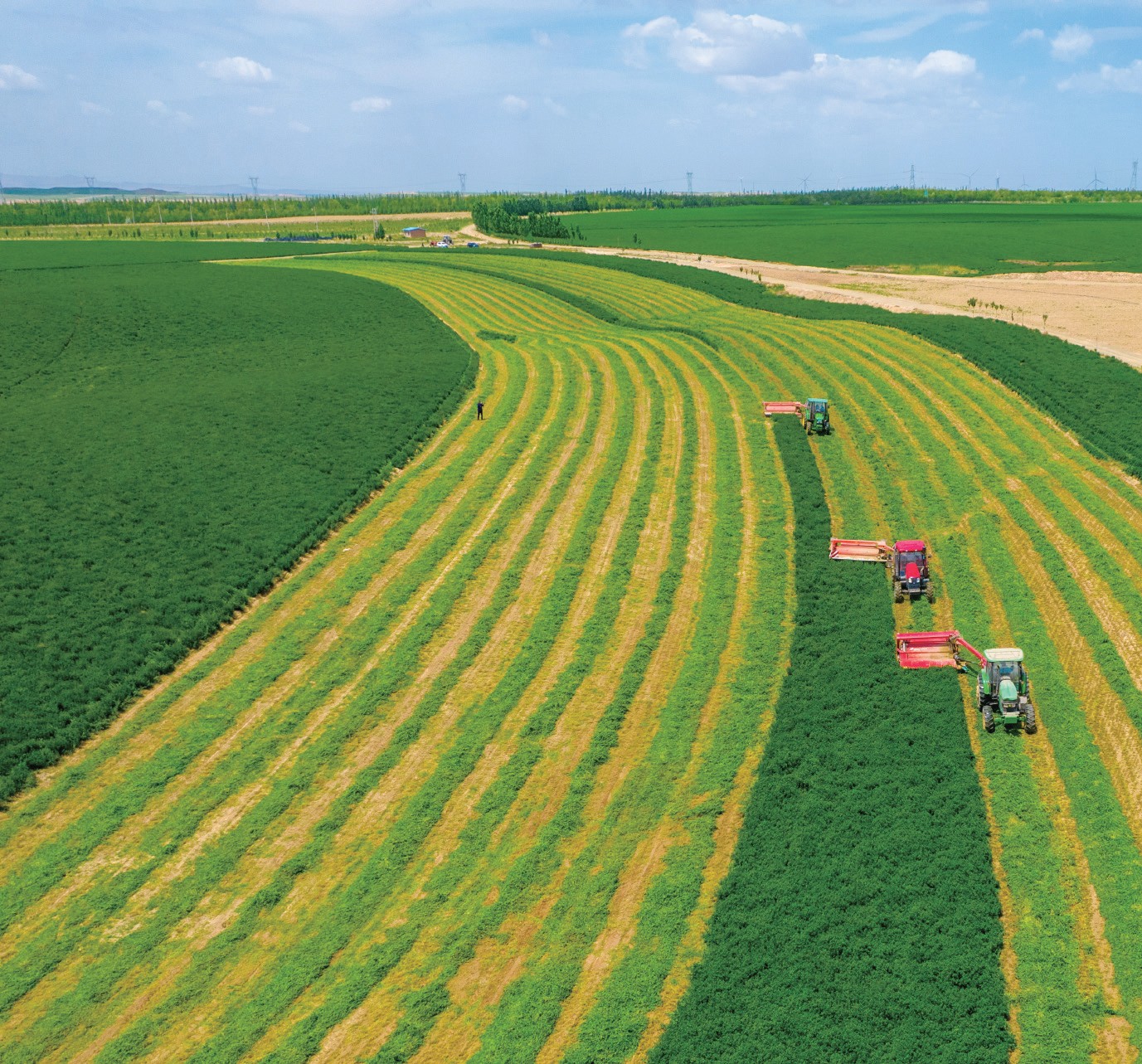 采访时正值公司第一茬紫花苜蓿收割,一个自走式喷灌区面积有1000 亩,场面壮观,记者赞叹苜蓿的肥美,黎谏君却说他看过水资源充足地区种植的苜蓿涨势比这好很多,“亩产比这高出五成”,“而区别恰恰是水”。据他介绍,苜蓿当前价格很好,所以公司选择大面积种植, 但苜蓿种植用水量大,不适合滴灌,现在的喷灌用水量又大于滴灌,他们也正在寻求更高效的苜蓿种植节水方法。