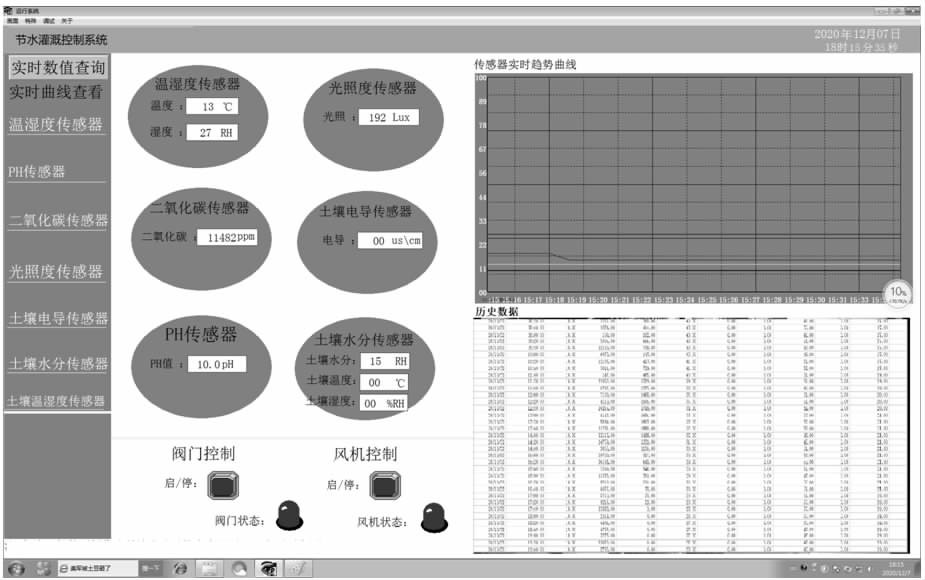 上位机监控软件采用组态王进行开发,单个温室的监控界 面如图 4 所示。上位机实现了终端节点数据的采集、历史数据的存储与查看、灌溉和抽湿指令的下发。在工作过程中,上位机 不断接收信息,将温室环境和土壤环境实时的显示在上位机界 面中。同时,系统自动记录接收到的数据,写在 Excel 表中,作为记录,可用于用户分析。根据接收到的参数信息,执行灌溉算法 和抽湿算法,判断出需要灌溉和抽湿时,发送灌溉指令和抽湿 指令给指定的温室。
