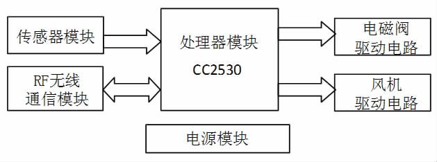 终端节点功能主要是对温室环境参数、土壤参数信息的收集 以及对温室风机、灌溉用电磁阀进行控制,包括传感器节点、电磁 阀控制器节点和风机控制器节点。传感器节点主要由处理器模 块、无线通信模块、传感器模块和电源模块组成。电磁阀控制器节 点由处理器模块、无线通信模块、电磁阀驱动电路和电源模块组 成。风机控制器节点由处理器模块、无线通信模块、风机驱动电路 和电源模块组成。它们都通过ZigBee 协议与本温室的路由节点通信,将 3 种节点表示在一个结构图上,如图 2 所示。