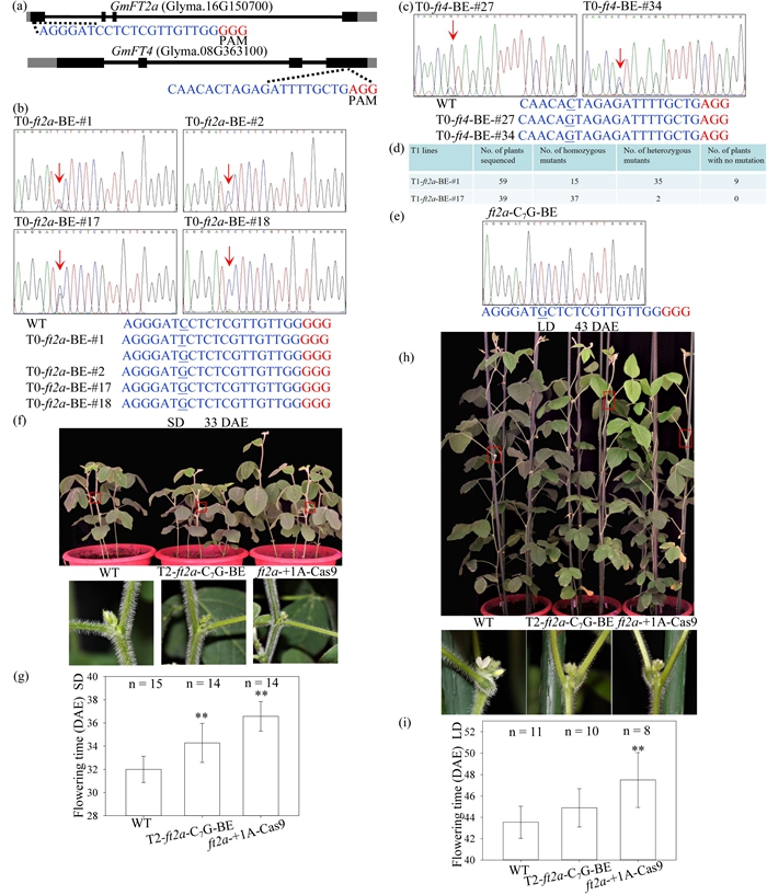 该研究通过组合Cas9n切口酶、大鼠胞苷脱氨酶和尿嘧啶糖基化酶抑制剂,建立了大豆单碱基编辑技术体系,并成功实现了大豆开花调控关键基因 GmFT2aGmFT4 的单碱基定向替换,效率分别为18.2%和6.0%。在 GmFT2a 靶位点实现了C→T和C→G两种类型的单碱基替换、在 GmFT4 靶位点实现了C→G单碱基替换。单碱基替换突变可稳定遗传,筛选获得的 GmFT2a 单碱基替换纯合突变系,在16小时光照/8小时黑暗和12小时光照/12小时黑暗的两种日照条件下均表现出晚花表型。该研究是大豆单碱基替换研究工作的首例报道,为精准修饰和利用单核苷酸多态性(SNP)改良大豆农艺性状提供了新技术、新方法。