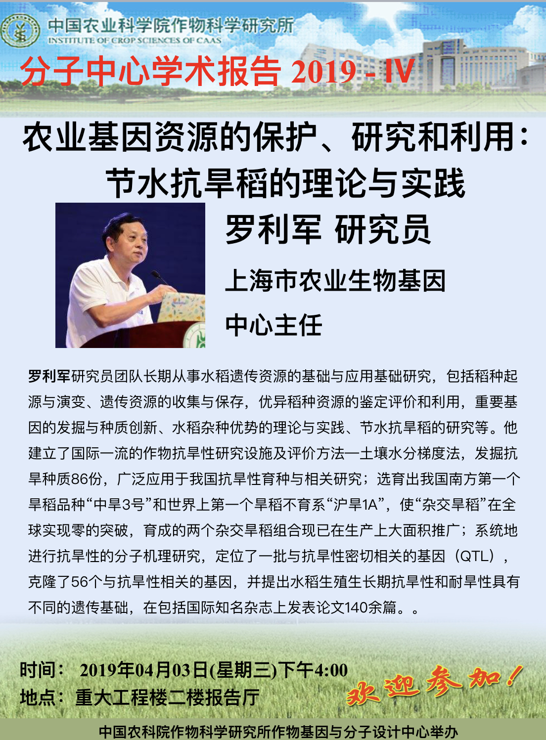 罗利军 农业基因资源的保护、研究和利用:节水抗旱稻的理论与实践(分子中心学术报告2019-4)