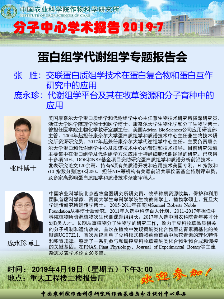 张胜 交联蛋白质组学技术在蛋白复合物和蛋白互作研究中的应用, 庞永珍 代谢组学平台及其在牧草资源和分子育种中的应用(分子中心学术报告2019-7)