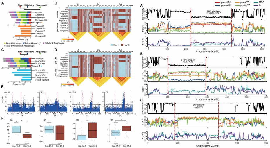 左:小麦1A、2A、6A染色体跨着丝粒区形成很大的与重要性状相关联的单倍型区段;右:以系谱为基础,根据骨干亲本衍生品种多样性变化情况可基本判断这些区段育种价值的优劣