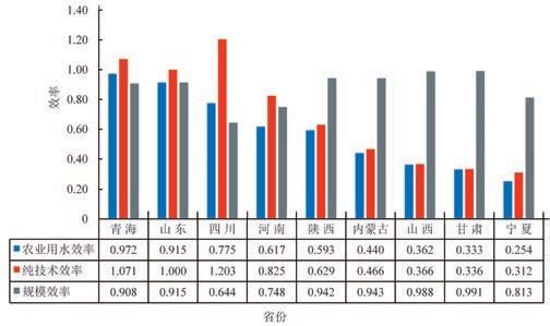 川、河南 4 省、其余 5 省份都低于 0.6。分解来看,不同省份农业用水效率主要受何种因素影响也存在明显差异。农业用水效率高于 0.6 的 4 省,其纯技术效率和规模效率也高于0.6, 并且前者都高于后者;农业用水效率低于0.6 的5 省,其规模效率都高于0.8,但纯技术效率普遍低于0.6。由此可见,黄河流域各省中,农业用水效率较高的 4 省主要受纯技术效率影响,而农业用水效率较低的5 省主要受规模效率的影响。