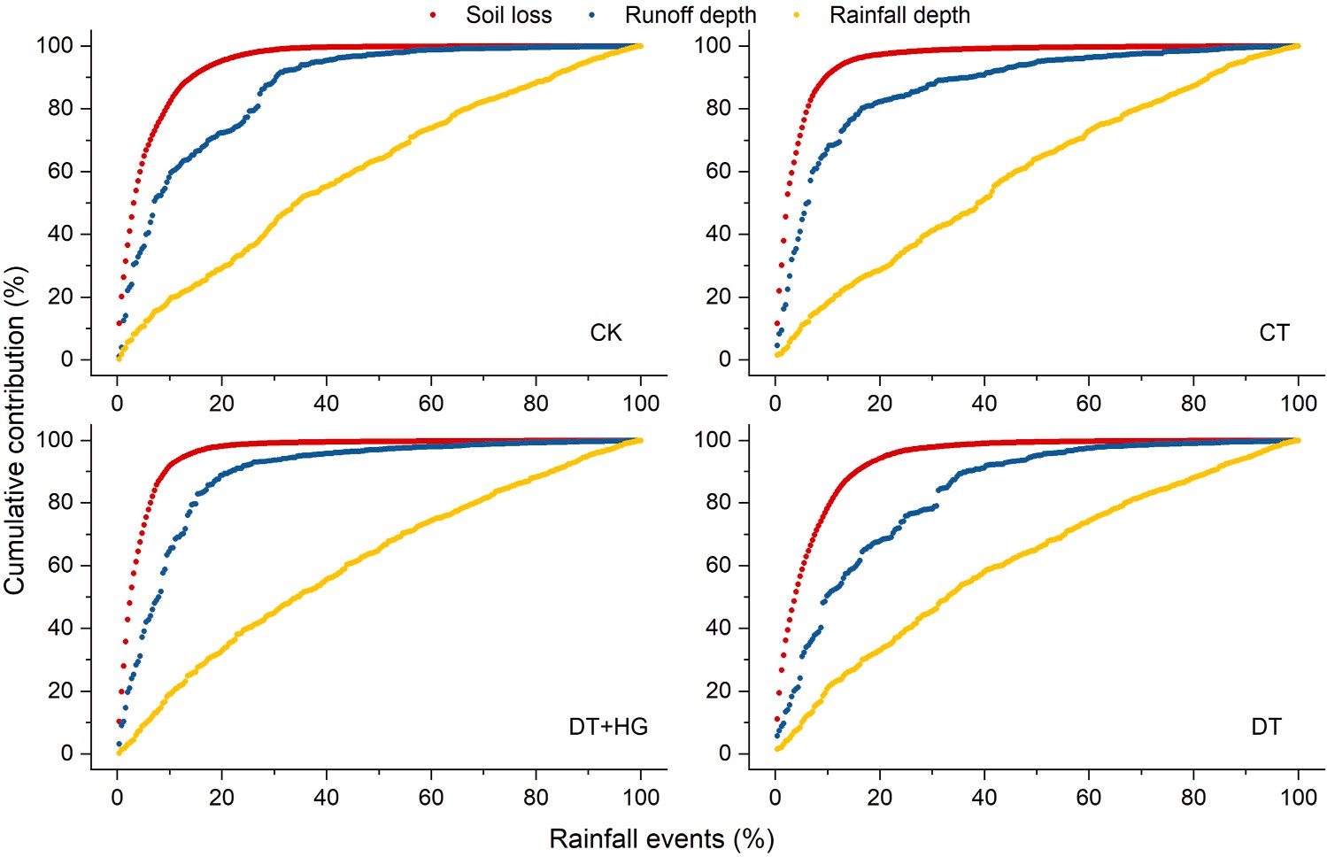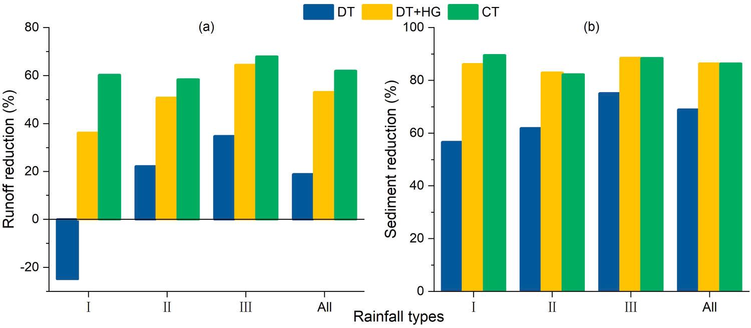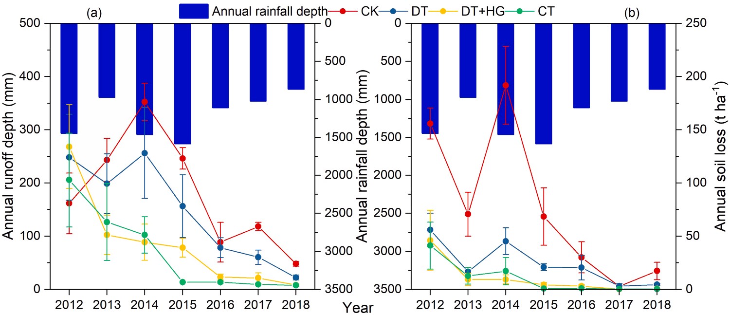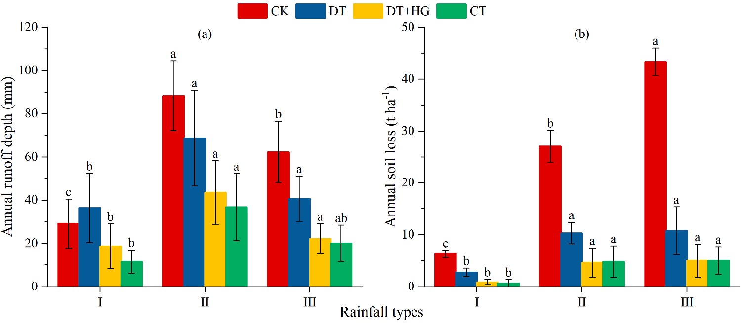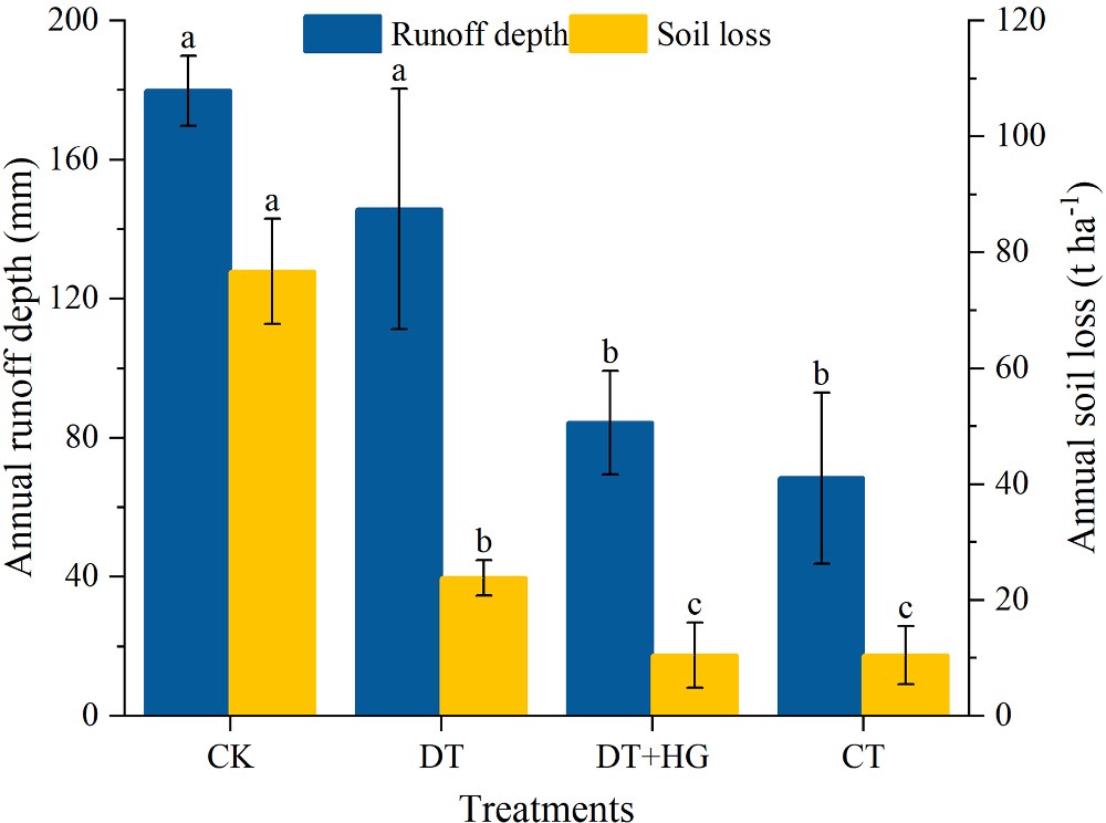 DT and DT HG was 145.79 and 84.34 mm, respectively. Runoff depth was significantly (P < 0.05) lower in CT and DT GH compared with CK and DT. The highest average annual soil loss was found in CK