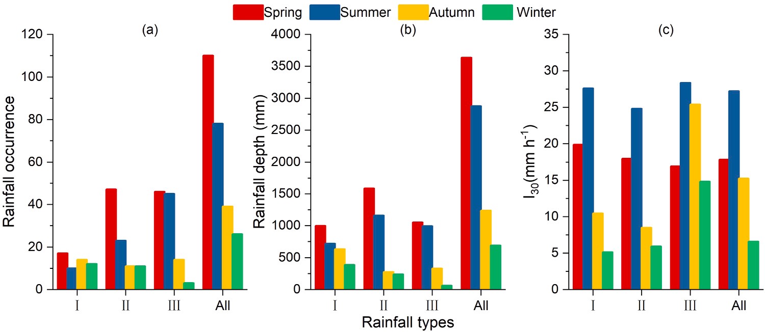 observed. Rainfall type II, characterized by normal rainfall, had a moderate depth, moderate duration, and moderate maximum-30 min rainfall intensity; this rainfall type occurred 92 times during the seven years. Considering seasonal distributions (Fig. 2), rainfall type I mainly occurred in spring (from March to May) and autumn (from September to November) with the total occurrence of 31 times and 58.5% probability; rainfall type II mainly occurred in spring with the highest seasonal occurrence of 47 times and 51.1% probability; and rainfall type III occurred both in spring and summer (from June to August), with 46 and 45 times and probabilities of 42.6% and 41.7%, respectively.