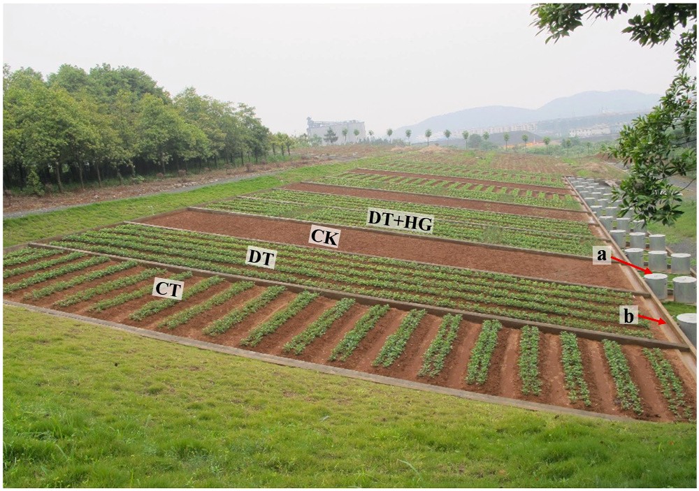 Fig. 1. Study site and runoff plots of different treatments. Note: a and b represent collecting buckets and drainage trough, respectively; CK, DT, DT+HG and CT represent bare flat land as control, downslope ridge tillage, downslope