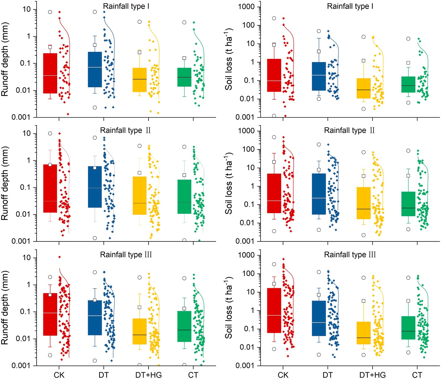 The Kolmogorov-Smirnov test showed that the data were normally or log-normally distributed. The one-way ANOVA test was used to test for differences in surface runoff and sediment yield between different management types and rainfall types. Spearman correlation was used to illustrate the correlations between the runoff depth, the soil loss, and rainfall characteristics. SPSS 17.0 was used to perform statistical anal- ysis, and OriginPro 2019b was used to draw charts.