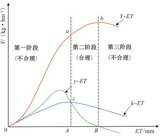 注:图中ET 为耗水量,mm;Y 为单位面积产量,kg/hm2;y 为边际产量;k 为水分生产效率。
