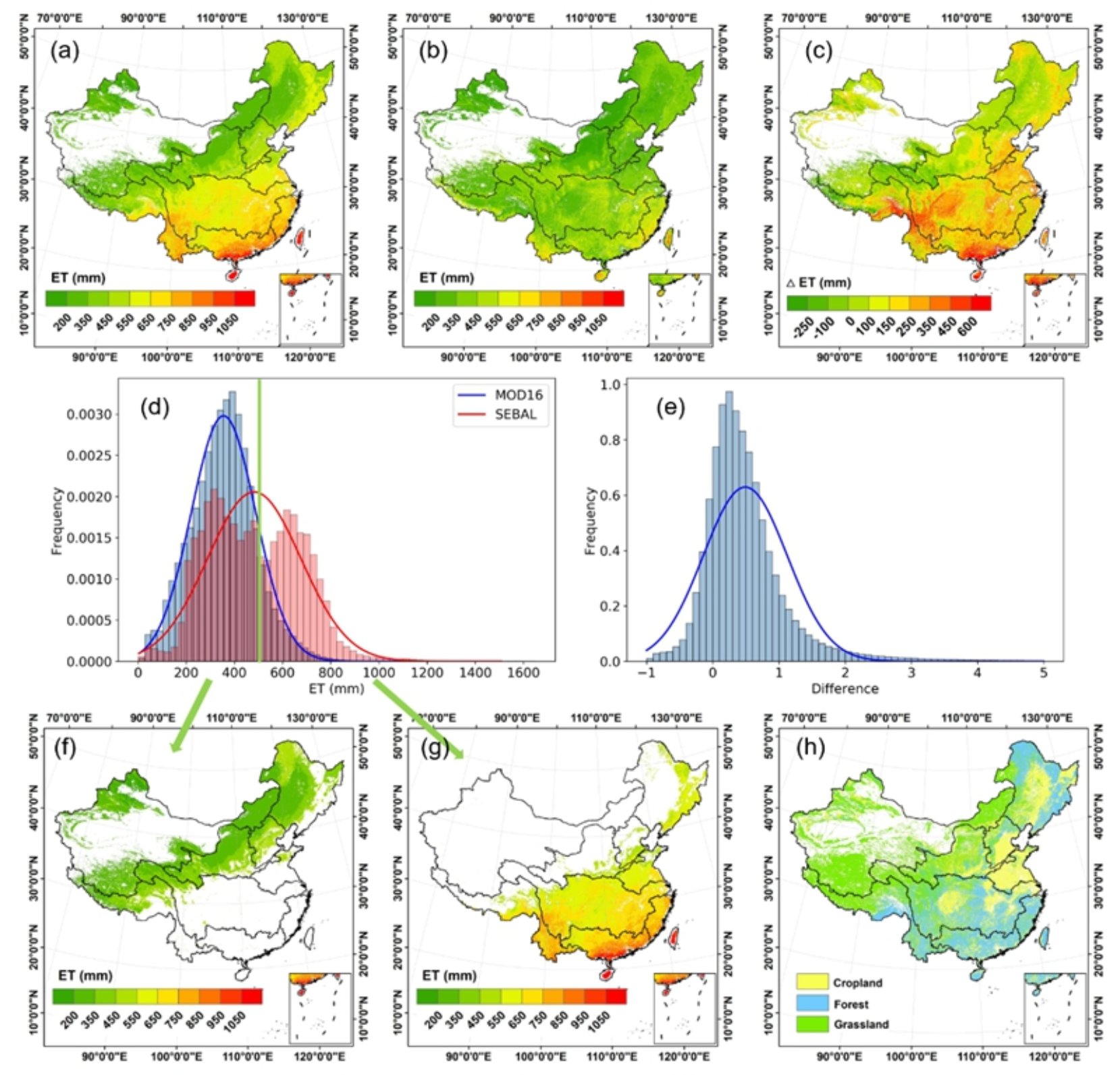 图1. SEBAL 和 MOD16 模型之间的比较。(a) 年平均ET SEBAL 的分布。(b) 年平均ET MOD 的分布。(c) SEBAL 和 MOD16 之间的差异分布(ETSEBAL – ETMOD)。(d) 年平均ET SEBAL和ET MOD 的直方图。(e) SEBAL 和 MOD16 之间相对差异的直方图 (( ET SEBAL – ET MOD )/ ET MOD )。(f) ET 地图SEBAL低于 500 毫米。(g)超过 500 毫米 的ET SEBAL地图。(h) 中国的土地覆盖类型。