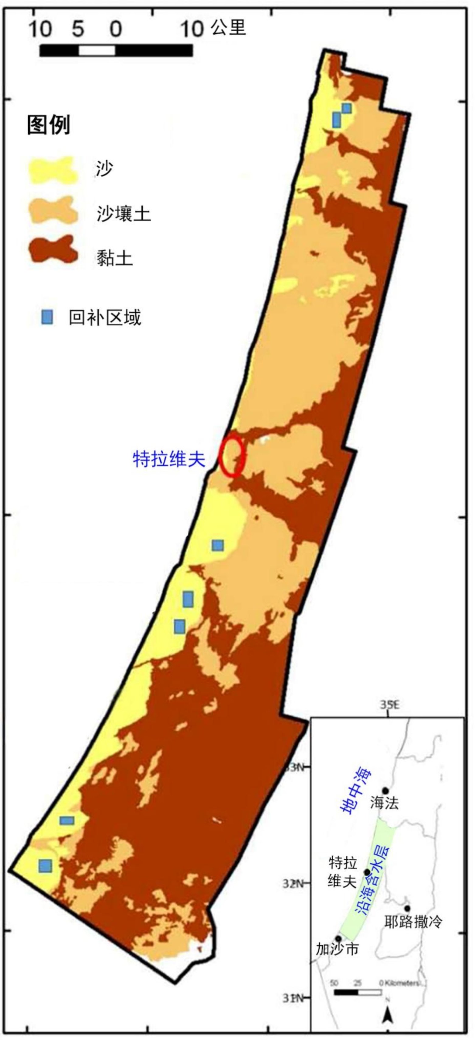 图1 地中海含水层覆盖土壤类型和回补系统位置