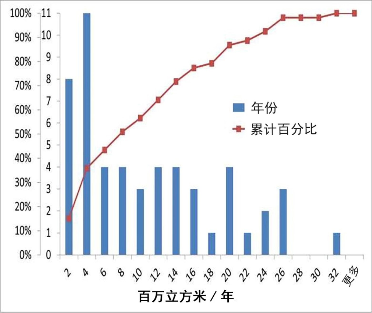 梅纳什河系统成功运行50多年的根本原因是稳定而简单的水文地质结构:(1)水源地位于具有较高径流系数(降水量的10%-30%)且没有含水层的岩石盆地;(2)入渗地是渗透性较好且具有优质含水层的沙地(径流系数<0.5%)。该系统运行53年来(1967-2019年),年均回补量990万立方米,最大回补量3180万立方米/年,其中3年由于干旱没有进行回补。图2显示,超过1/3年份的回补量小于400万立方米/年,2/3年份的回补量小于1300万立方米/年。