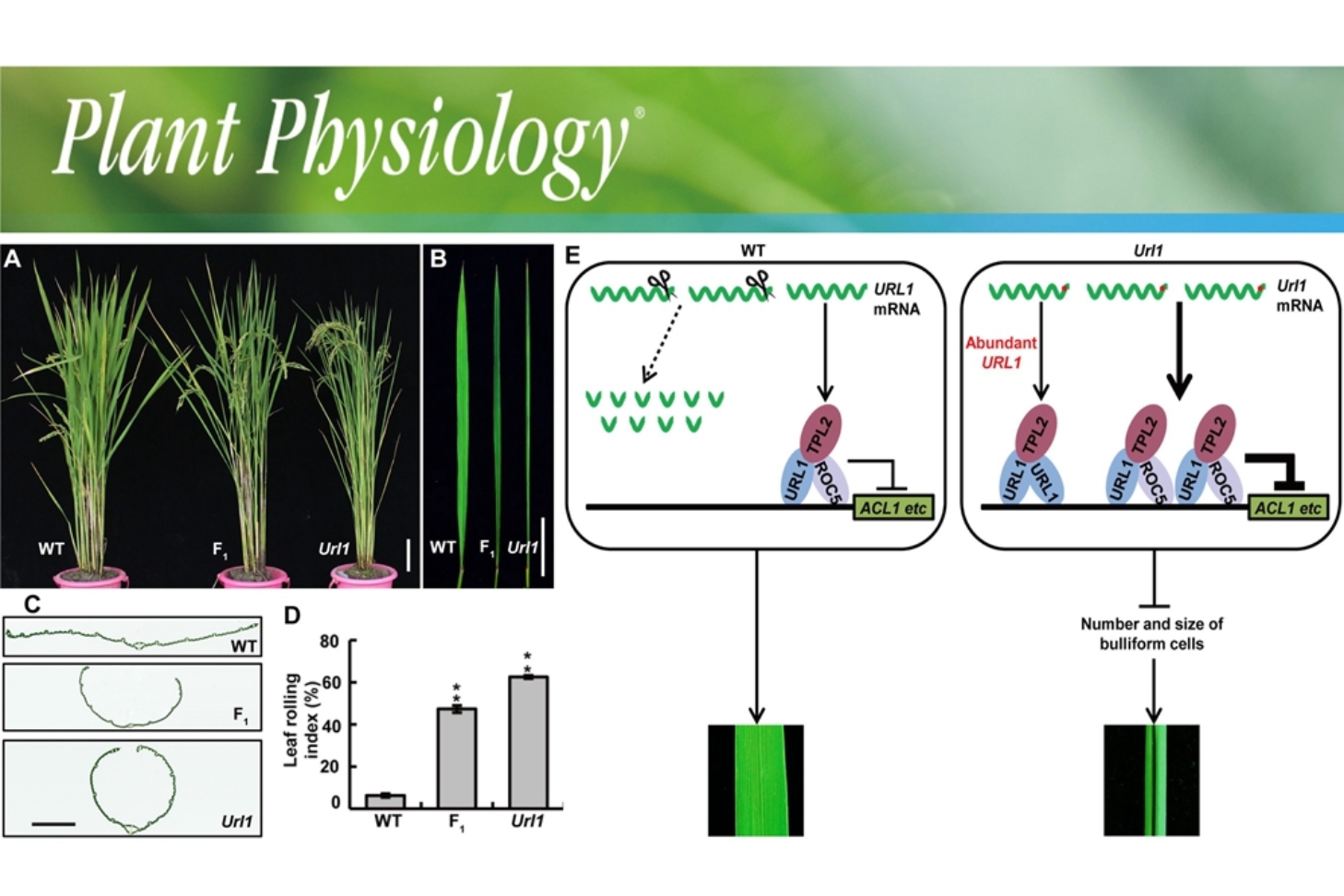 本研究通过诱变粳稻品种日本晴,获得了一份半显性内卷叶突变体 Url1 ,其叶片上表皮泡状细胞数目和面积减少,导致叶片内卷,因而该突变体株型直立,但株高、穗型、育性及籽粒大小均未受到不利影响,适宜在高密度条件下种植。研究人员分离获得了 URL1 基因,进一步生化分析表明,URL1参与形成转录抑制复合物,直接结合到泡状细胞发育正调控因子 ACL1 基因启动子上并抑制其表达,从而导致叶片卷曲。这些结果表明 URL1 在水稻叶形调控中具有重要作用。该项研究有助于构建和完善水稻叶片卷曲分子调控网络,对水稻株型育种具有重要的理论和指导意义。