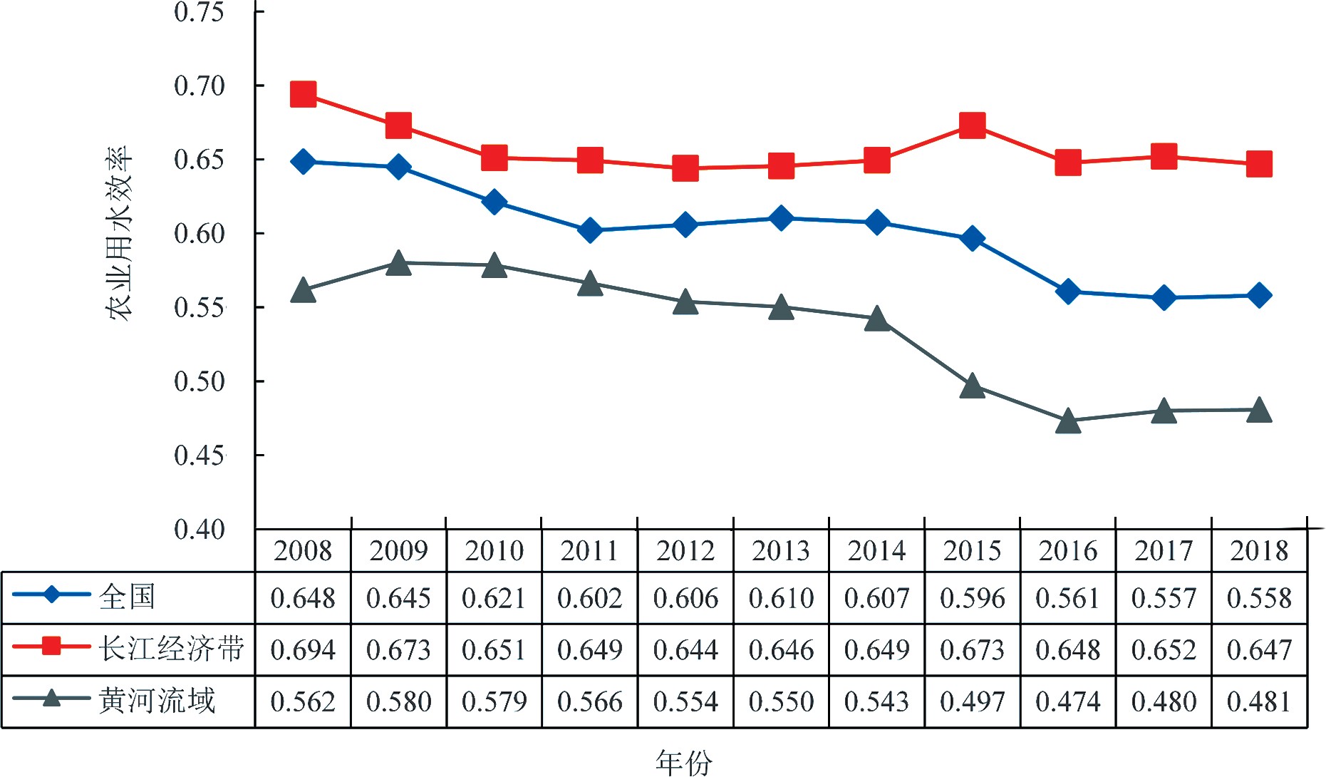 图1 2008-2018 年黄河流域与全国、长江经济带的农业用水效率比较Fig. 1 Comparison of agricultural water use efficiency in the Yellow River Basin,the Changjiang River economic belt and the Whole Country,2008-2018