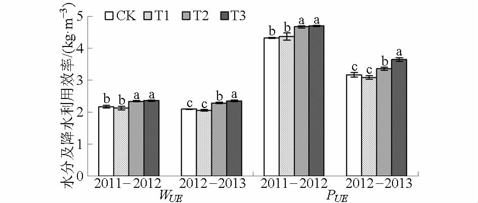 产量水平的 WUE 是衡量节水措施的一项重要指标,而 PUE 则能反映旱地农业中降水的生产潜力。不同处理连续 2 年试验,冬小麦 WUE 和 PUE 如图 3 所示。由图3 可知,T2 和T3 处理WUE 在第1 个生长季分别较 CK 提高 8. 17% 和 9. 05% ( P < 0. 05) ,较 T1