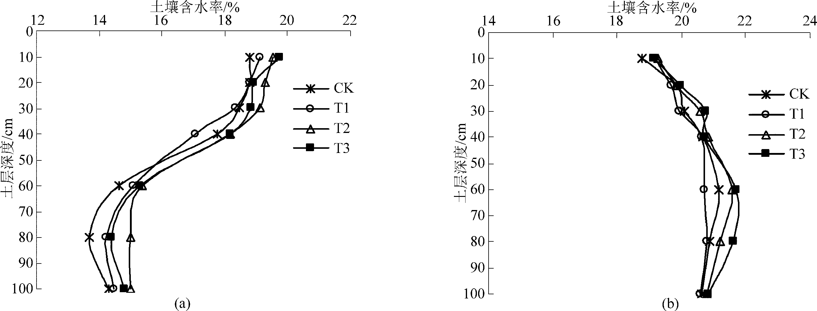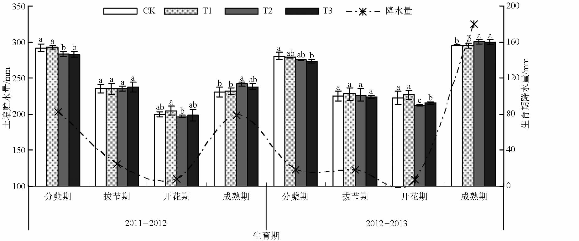 0. 05) 。30 ~ 40 cm 土层各处理土壤含水率逐渐下降,其中,T2 和 T3 处理土壤含水率分别较 T1 提高 5. 39% 和 4. 59% ( P < 0. 05) ,与 CK 处理差异不显著。60 ~ 100 cm 土层土壤含水率表现为 T2 处理较CK 提高 6. 39% ( P < 0. 05) ,T1 和 T3 处理与 CK 差异不显著。2012—2013 年冬小麦成熟期 0 ~ 100 cm 土层土壤含水率随深度的增加呈先升后降的趋势( 图2b) 。统计分析表明,0 ~ 40 cm 土层各处理土壤含水率差异不显著,这可能与该时期降雨量较多有关。30 ~ 40 cm 各处理土壤含水率变化均较为缓和,其中 T2 和 T3 处理土壤含水率较 CK 分别提高2. 37% 和 3. 35% ( P < 0. 05 ) ,较 T1 分别提高