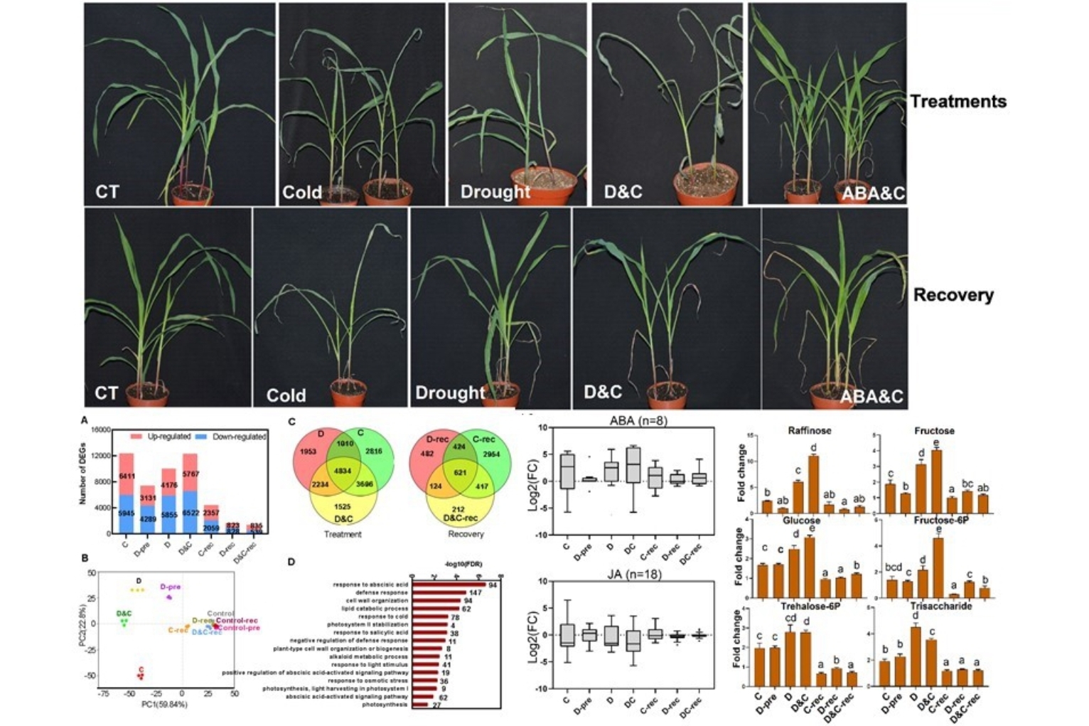 本研究通过系统分析苗期玉米在单一干旱、冷害以及二者联合胁迫条件下的表型和光合生理差异,发现联合胁迫条件下干旱能够明显缓解冷害胁迫对玉米光合和生长等造成的损伤。通过转录组学和代谢组学分析,发现相对于单一冷害胁迫,联合胁迫诱导大量脱落酸合成及脱落酸合成关键基因上调、与胁迫响应相关糖类(棉子糖、海藻糖等)合成及其合成关键基因上调、胚胎发育晚期丰富蛋白编码基因上调、光合相关基因下调等;进一步通过外源脱落酸喷施的平行试验,验证了联合胁迫下干旱诱导产生的脱落酸在增强植物冷害耐受性中具有重要作用。