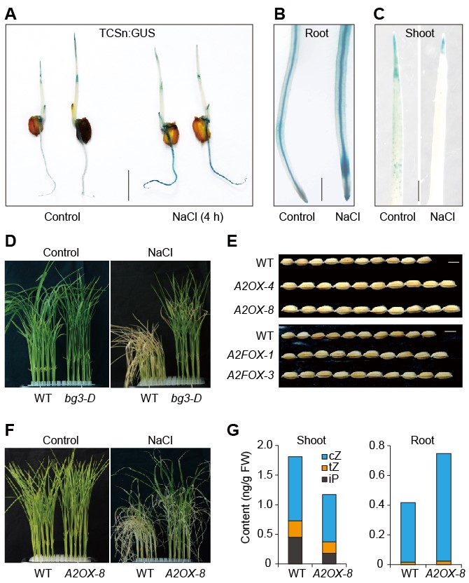 该研究首次发现,植物可通过调整细胞分裂素的空间分布对高盐胁迫做出响应,从而提高对胁迫的适应性。通过操纵参与此过程的关键组分,不仅可发挥细胞分裂素促进生长发育的功能,还可大幅增强植物的耐逆性。与整体操纵激素的含量不同,操纵激素转运体现了一种更经济弹性的原则,并有望克服高产高抗之间的矛盾,因此在分子设计育种上具有巨大潜力。在这此理论基础上,研究人员发现过表达 AGO2 或 BG3 均可通过改变细胞分裂素空间分布显著增加水稻粒长和耐盐性,从而验证了这一途径的可行性。