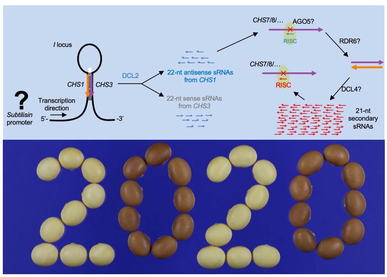 研究人员利用基因组编辑技术同时敲除了天隆1号大豆品种中两个编码DCL2蛋白的同源基因( GmDCL2a 和 GmDCL2b ),获得 Gmdcl2a/2b 双突变体。测序表明,22-nt siRNA在该双突变体中缺失。突变体中靶向沉默查尔酮合成酶基因( CHS )的22-nt siRNAs和次级的21-nt siRNAs无法生成,导致种皮中酮类物质合成酶的累积量显著增加,大豆种皮颜色从黄色变为棕色。该研究揭示了DCL2在调节自然性状中的重要作用,为改良大豆外观品质提供了新思路。