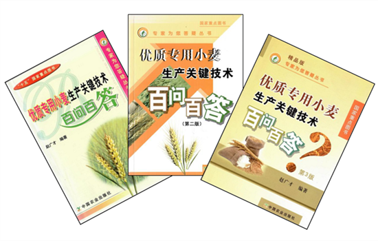 优质专用小麦在我国分布广泛,各地生态条件、种植模式和技术需求差异很大;同时,优质专用小麦产业链涉及栽培、耕作、土壤、肥料、育种、植保、农机、加工等多个环节,系统性强,涉及面广。因此,要将先进理念和技术融会贯通,创作出适合受众阅读、喜爱、又能提升其科技素养的实用作品,具有较大难度。赵广才研究员带领团队历时15年,在我国10个小麦生态区开展生产需求调研,范围涉及100余个典型县、500余名科技人员、1000余个示范户、种粮大户和种麦农民,精心创作了《优质专用小麦生产关键技术百问百答》系列科普图书。该套作品包括三个版本的《优质专用小麦生产关键技术百问百答》(2005年第1版、2009年第2版、2013年第3版)及其精简版《小麦优质高效栽培答疑》。这套科普作品为广大小麦生产者迅速掌握科学种麦技能提供了指导,不仅通过提高小麦的产量和品质,促进了优质专用小麦的生产,还通过科学的生产管理节约成本,为农民创造了经济效益,助力精准扶贫。