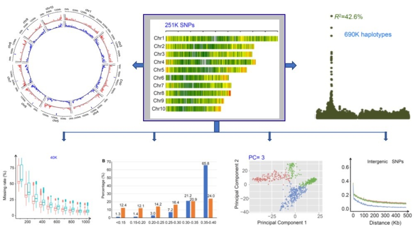 联合研究小组首先从前期研发的玉米55K SNP芯片挑选多态性高、缺失率低、染色体上分布均匀的20K SNP标记,结合靶向测序基因型检测(Genotyping by Targeted Sequencing, GBTS)技术,对标记探针进行液相捕获,完成了1K、5K、10K、20K等一系列液相芯片标记的开发。利用96份来自世界各地的玉米自交系和387份育种项目产生的中间材料对液相芯片进行测试,证实了芯片检测的高度重复性和可靠性(Molecular Breeding 39:37, 2019)。随后,经过技术优化和改进,使单个液相芯片的检测效率在玉米中增加到40K mSNP、260K SNP、912K 单倍型。根据应用场景对标记密度的需求,通过控制测序深度就可以从同一标记集获得从1K 到40K mSNP任意位点(扩增子)以及由此衍生的不同数量的SNP标记和单倍型(Plant Communications 2: 100230, 2021)。
