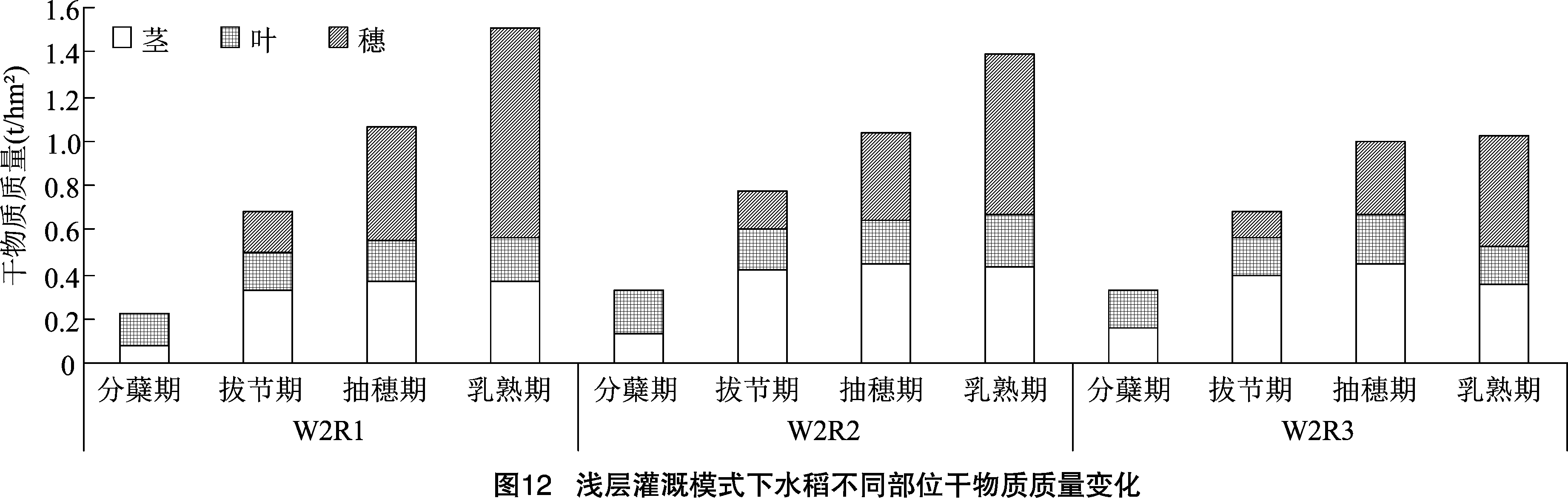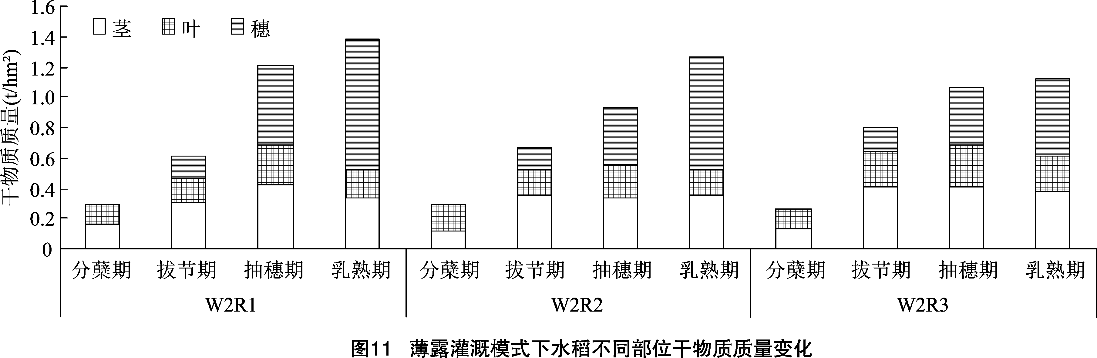内各部位干物质质量变化见图 10 ~ 图 12。 水稻各生育阶段不同部位干物质质量分配情况变化基本一致,水稻茎和叶质量在抽穗开花占比最大; 穗则是从拔节期开始积累, 在抽穗期和乳熟期逐渐积
