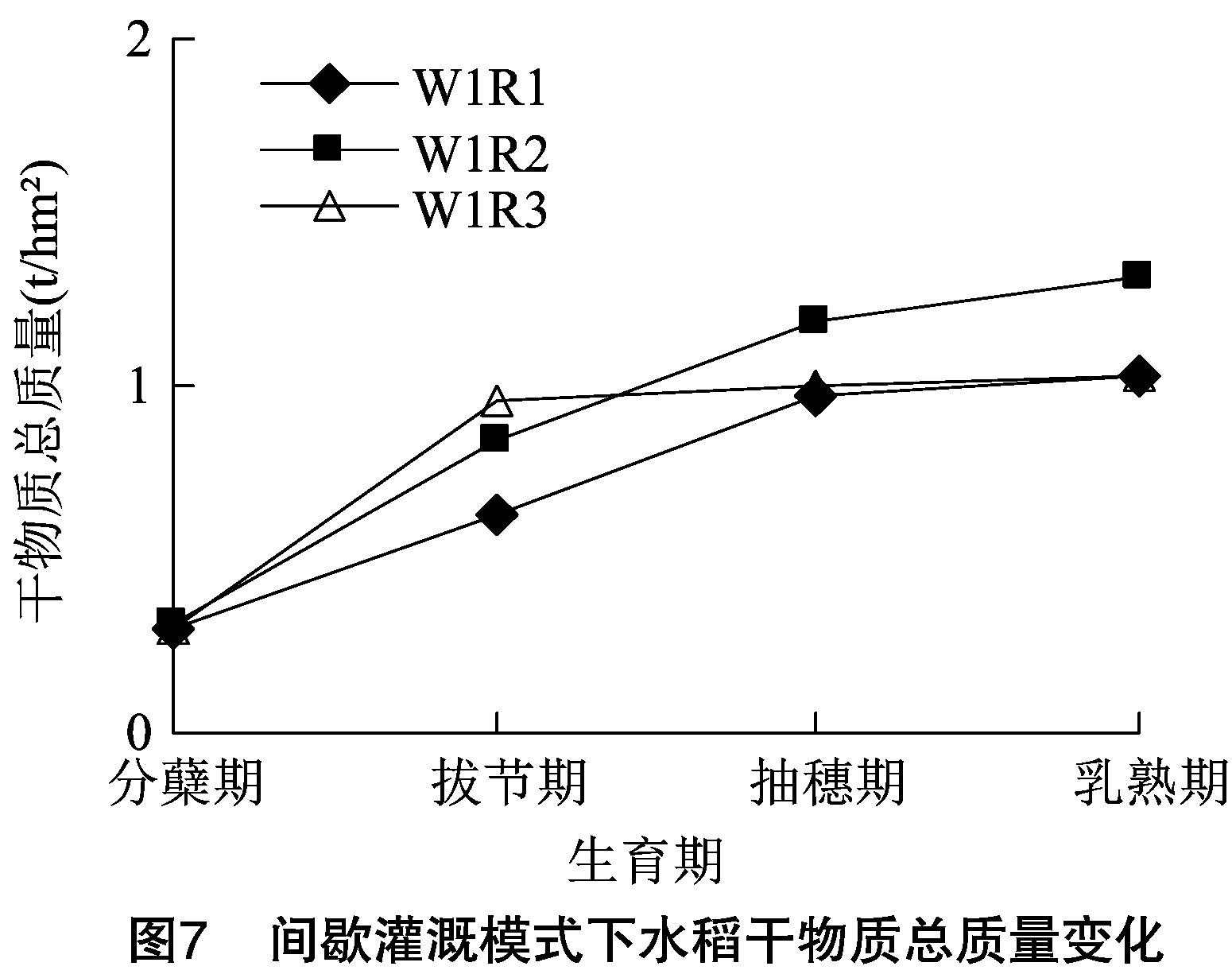 趋于稳定,其中拔节孕穗期到乳熟期积累速率最快。间歇灌溉模式( W1 ) 下, 一级水和二级水水源