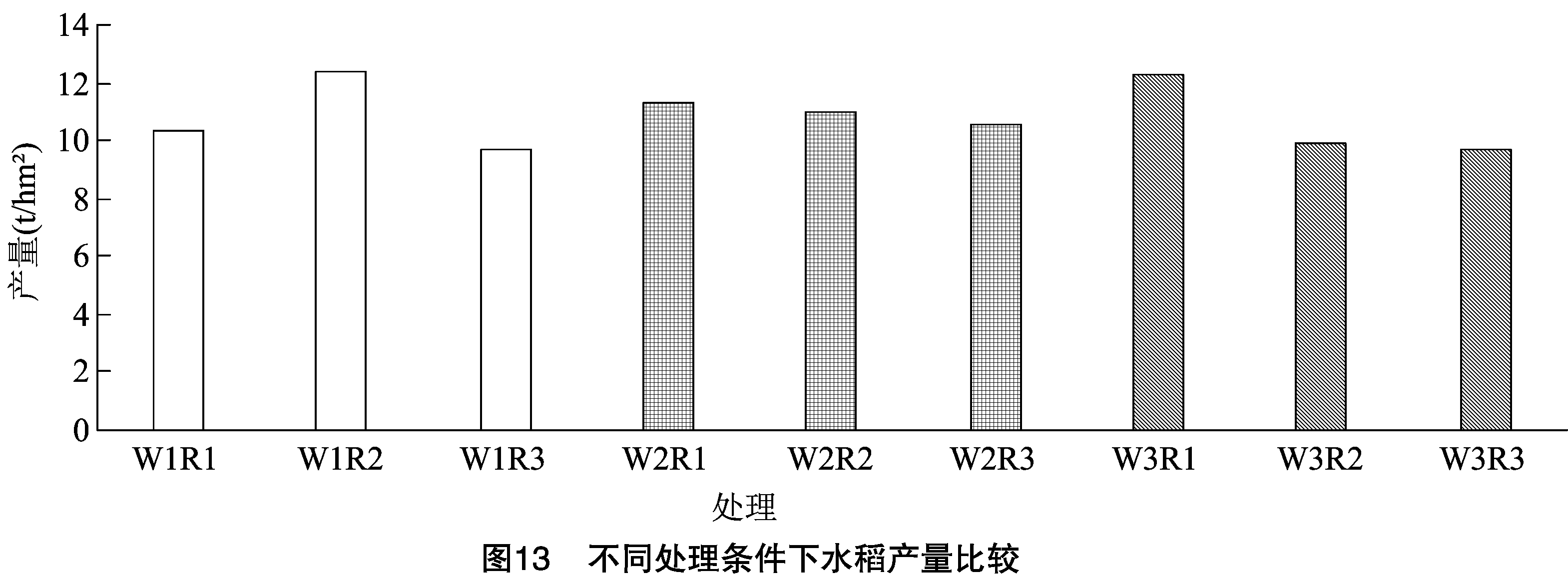 ( W3),其较间歇灌溉( W1) 和薄露灌溉( W2) 分别高 17. 5% 和 8. 6% 。 二级水处理( R2) 下,产量最高为间歇灌溉( W1),其较薄露灌溉( W2) 和浅层灌溉