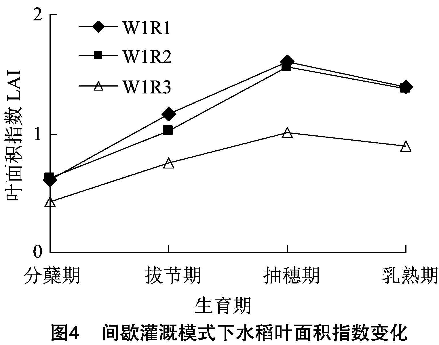 ( W1) 和薄露灌溉( W2)。 在灌溉模式相同情况下, 再生水水源灌溉有利于水稻叶面积指数增长且延缓水稻叶面积指数降低。