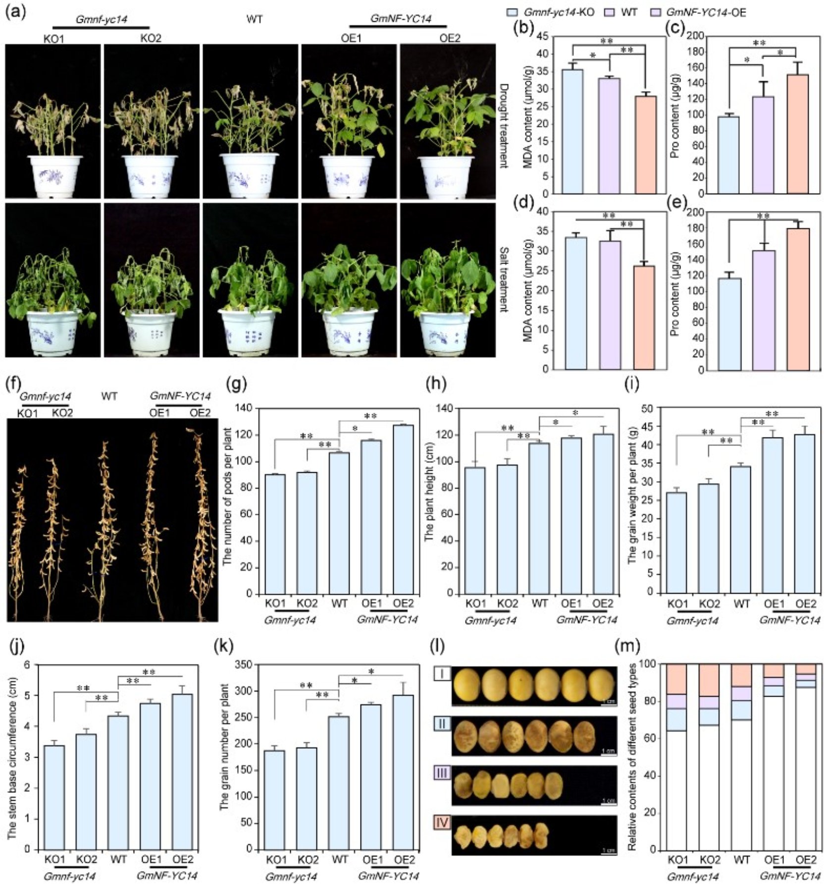 研究发现,大豆核因子Y转录因子成员NF-YC14,能够通过形成异源三聚体的方式,激活PYR1介导的脱落酸信号通路来调节大豆的耐逆性。研究人员还发现, NF-YC14敲除突变体比野生型大豆植株对干旱更敏感。此外,田间试验表明,在大豆中过表达NF-YC14或PYR1基因可以增强大豆的抗旱能力,且转基因大豆在干旱条件下表现出单株产量提高以及籽粒饱满度和茎基部周长增加。综上所述,该研究扩大了对植物核因子Y转录因子功能的认知,并提出了有关植物中脱落酸信号通路整合的重要问题。此外,NF-YC14和PYR1基因在提高大豆植株耐逆性方面具有潜在的应用前景。
