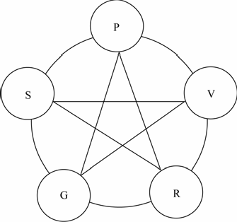 基于水循环一般规律的水量转化或水交换是水资源评价与合理利用的基本科学依据。水量转化过程包括: 从大气向陆地, 由水汽到降水, 由降水转化为土壤水、地表水、地下水(包括赋存于包气带与饱和带中的地下水); 从陆地向大气, 由土壤、地表、地下的液态水通过蒸发汽化转化为大气水分。在农田生态系统, 存在着包括植物水分在内的五水转化过程。五水是指大气、植物、地表、土壤和地下水层中的水。图 1 中, P、V、R、S 和 G 分别代表降水、植物水、地表水、土壤水和地下水, 五水之间存在着相互作用和相互转化过程(图 1)。