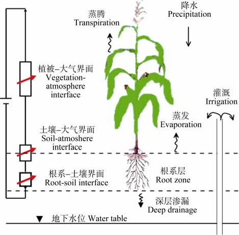 农田水分的转化主要发生在在土壤−大气界面、根系−土壤界面、植被−大气界面上(图 2)。因此, 对水分转化的界面过程进行调控, 是节水研究的科学依据。
